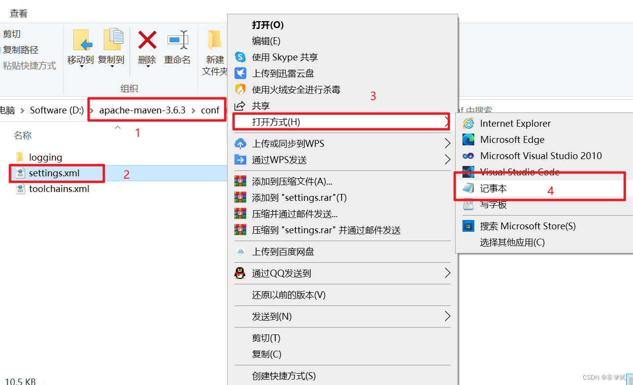 1)、打开 Maven 的安装目录 --> conf 文件夹 --> setting.xml 用记事本打开