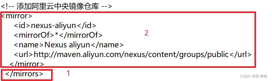 2)、在 <mirrors></mirrors> 标签中添加下面代码:注意(在 </mirrors> 的上一行添加,不要添加到注释里面去了)