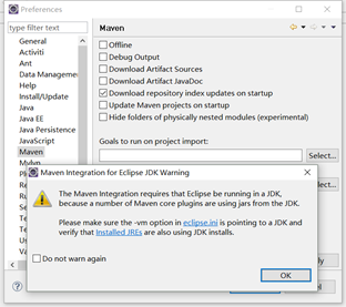- 打开preferences点击Maven后,会出现下面的警告框,需要配置下eclipse.ini文件