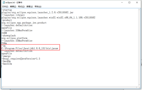 | 解决上面的问题,只需要在eclipse.ini文件添加下面两行代码 -vm C:Program FilesJavajdk1.8.0_131binjavaw | |