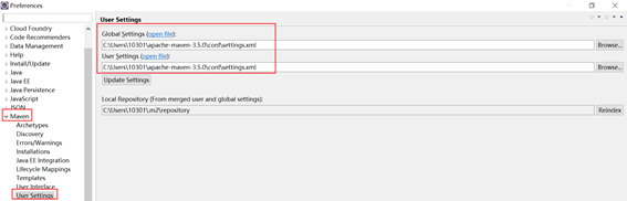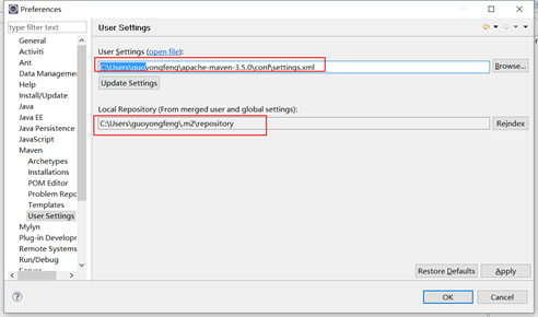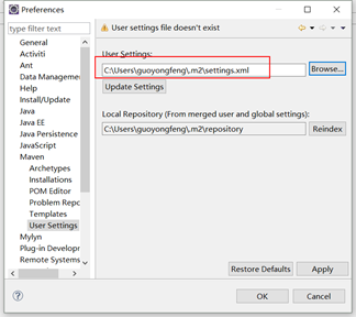 - 在偏好设置中,配置user settings选向为用户目录的settings.xml