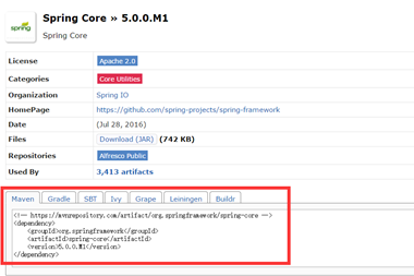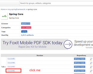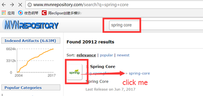 - 假设搜索所spring core,如图然后点击sping,接点选择所需要的版本,就能看到所需要的jar包了