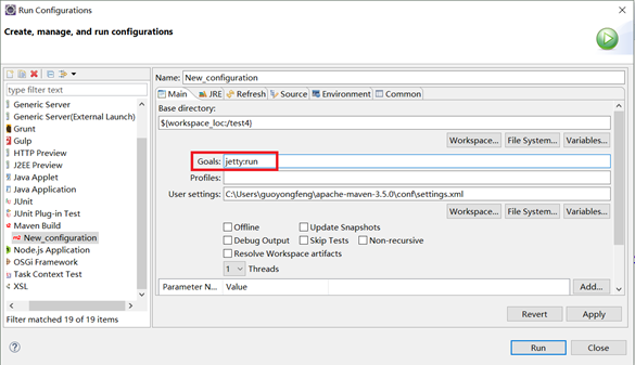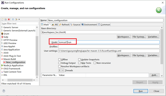 - 直接在运行配置中配置一个tomcat:run,默认跑的是tomcat 6.0,如图