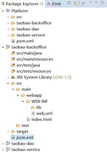 | 看下模块结构的结果,使用360打开war包,可见其它的jar所导入到了web的lib中了,这是 Maven自动导入的 |