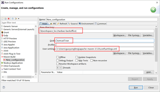 - 在backoffice的pom.xml中配置tomcat插件即可,然后配置run configurations的tomcat7:run