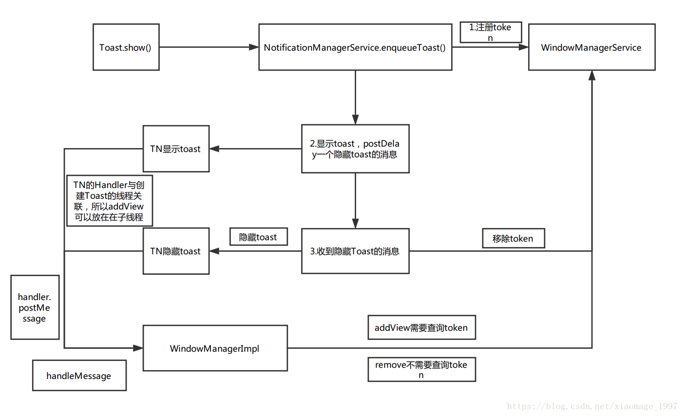 2.NMS为toast在WMS(WindowManagerService)中注册token,再通过TN对象显示toast,并且向自己postDelay一个隐藏toast的消息,需要注意的是,NMS用的是NMS所在线程的Handler,与后面所说的TN的Handler不是同一个。