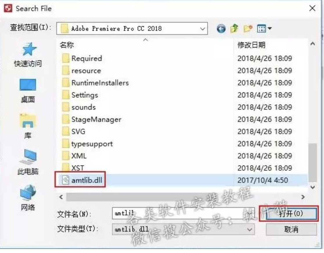 13.按照默认路径就打开C:ProgramFilesAdobeAdobe Premiere Pro CC 2018,找到amtlib.dll 选中,点击打开