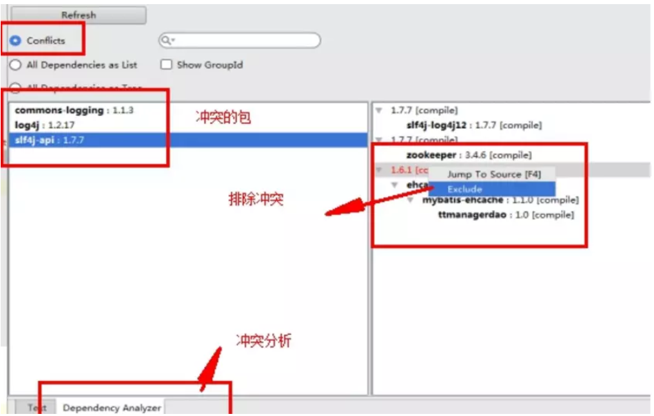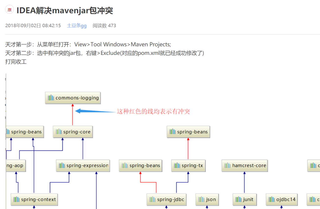 需要注意的是,排除冲突是个细致的工作,你不能发现自己的项目有很多冲突,你就全部把他们排除掉,你要做的是:观察你刚刚添加的jar包引入了哪些依赖,看你刚引入的jar包带来的依赖是否有冲突,如果有,把这些排除掉即可。
