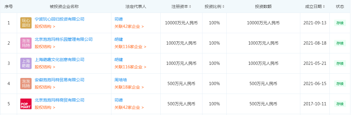 就在同一天,泡泡玛特耗资1亿元,成立了玩心回归投资公司,同样由泡泡玛特全资控股,值得一提的是,前不久泡泡玛特投资的两点十分动漫,也是具备投资性质的公司。