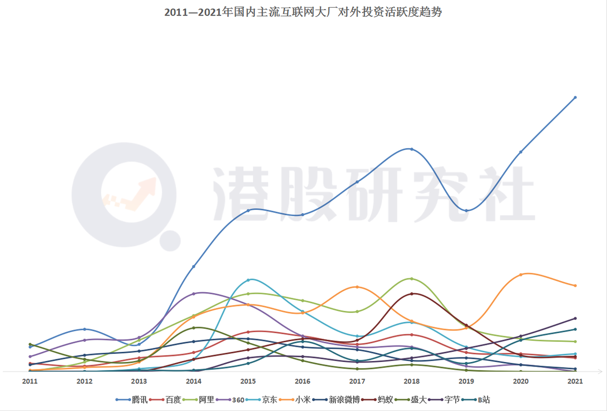 在事件数量上,2011至2021年期间,除去2011、2013年,腾讯长期稳坐在榜首的位置,截至目前,腾讯投资事件已经达到 201起,腾讯在投资界的收获,也让市场看到了投资回报。