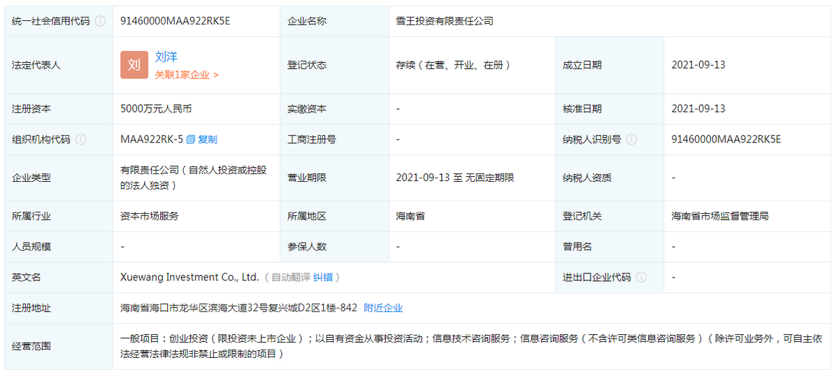 9月13日,雪王投资有限责任公司成立,注册资本5000万元,该公司由蜜雪冰城全资持股。