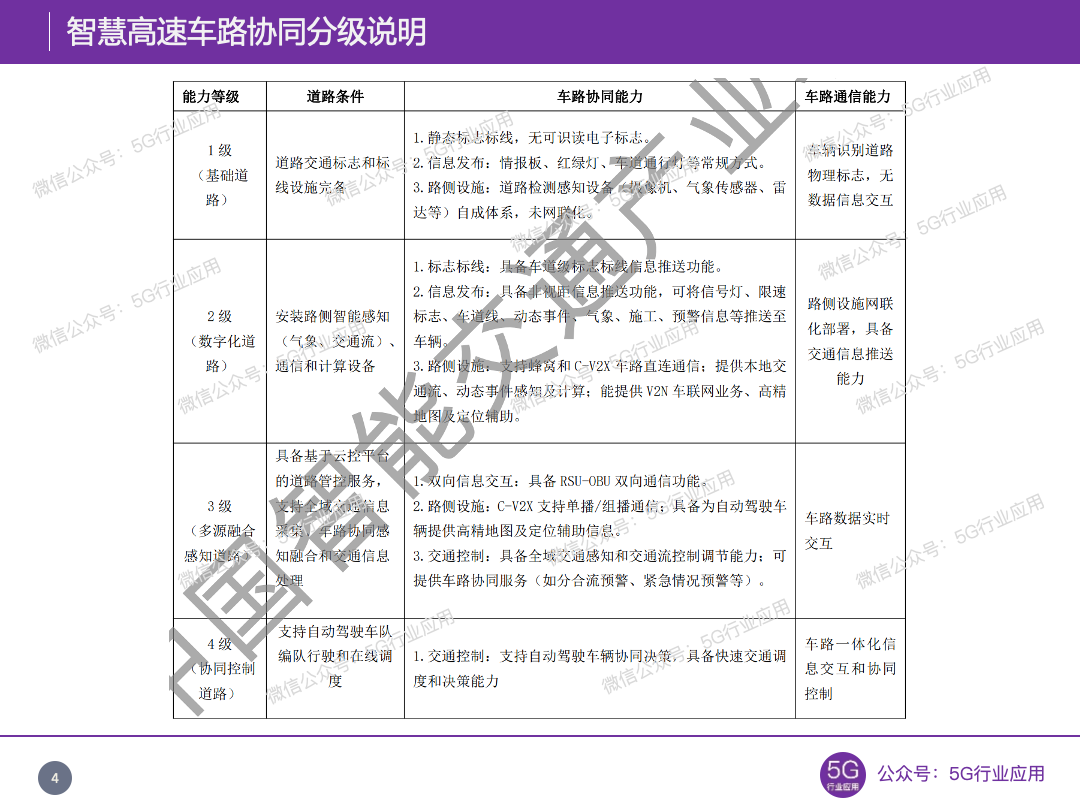 4级(协同控制道路),支持自动驾驶车队编队行驶和在线调度。交通控制:支持自动驾驶车辆协同决策,具备快速交通调度和决策能力。