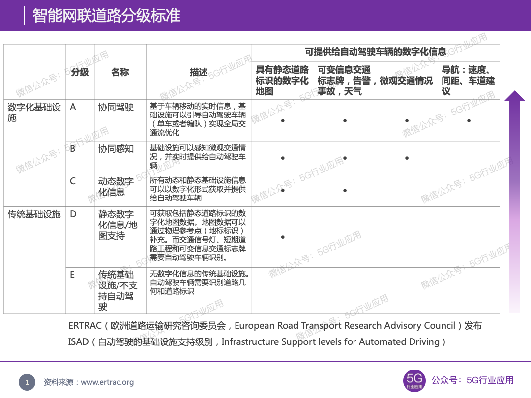 2019年3月,ERTRAC(欧洲道路运输研究咨询委员会,European Road Transport Research Advisory Council)发布《Connected Automated Driving Roadmap》,定义ISAD(自动驾驶的基础设施支持级别,Infrastructure Support levels for Automated Driving)[1]。
