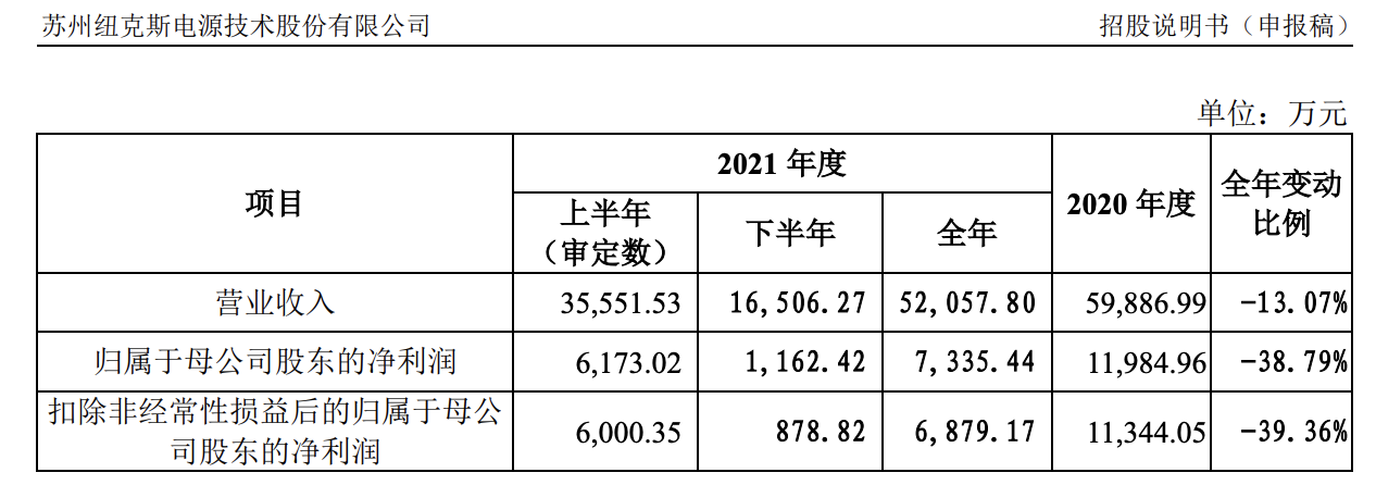 招股书(2022年3月版)显示,纽克斯2021年的营收为5.21亿元,较2020年的5.99亿元减少13.07%;净利为7335.44万元,较2020年同期的1.20亿元减少38.79%;扣非后净利润为6879.17万元,较2020年同期的1.13亿元减少39.36%。
