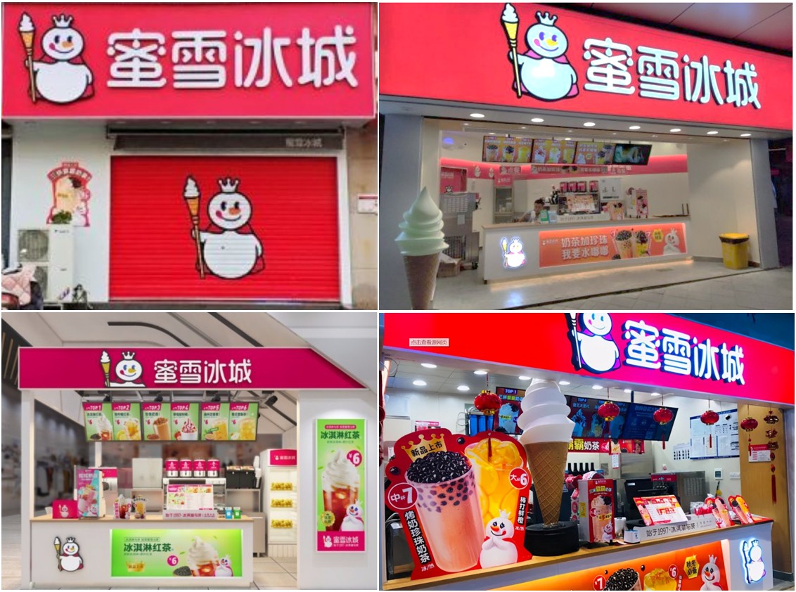 (上图:雪王IP形象在蜜雪冰城门头上的应用)