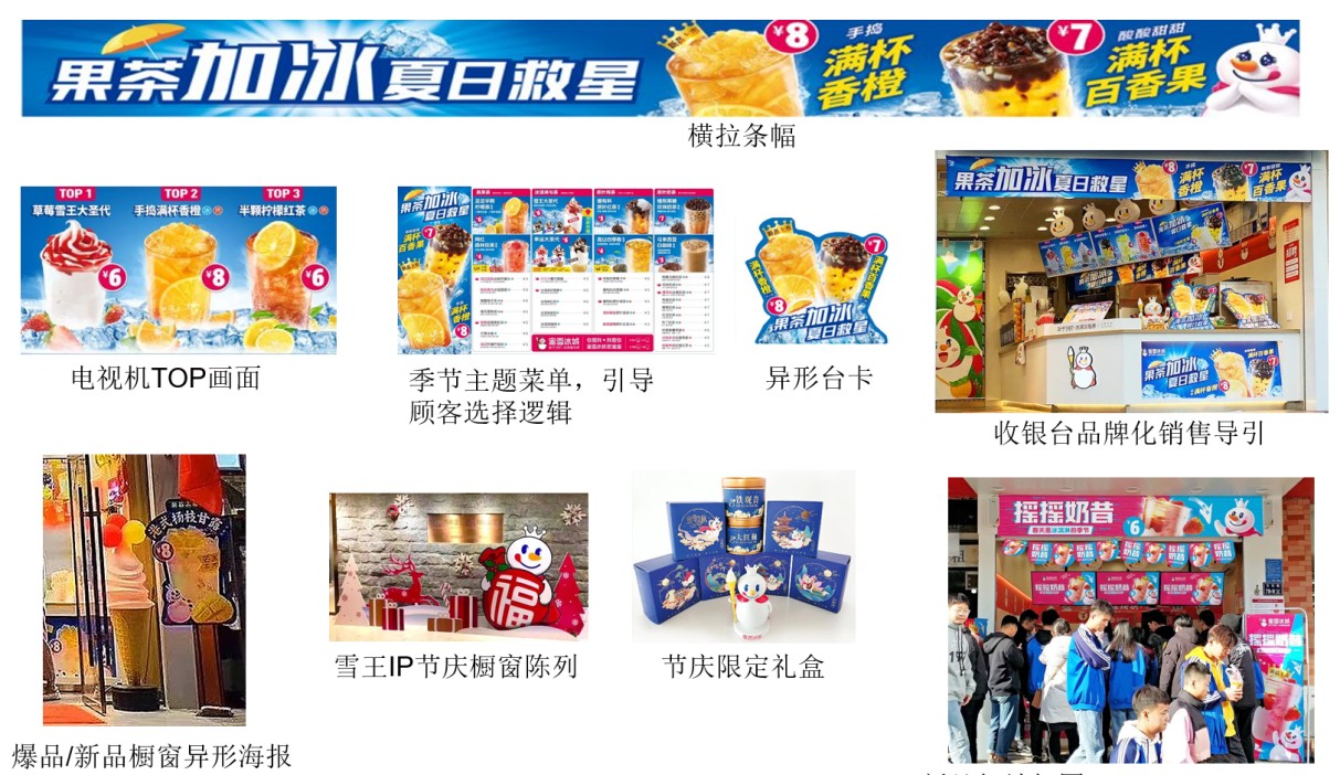 (上图:雪王IP形象在蜜雪冰城宣传物料的应用)