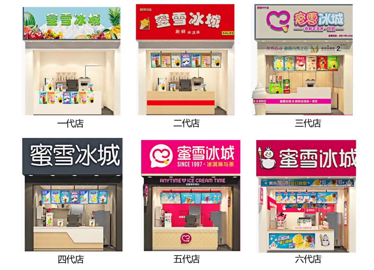 - 蜜雪冰城的字体在第五代店应用时已经相对成熟,是品牌形象的识别主体;