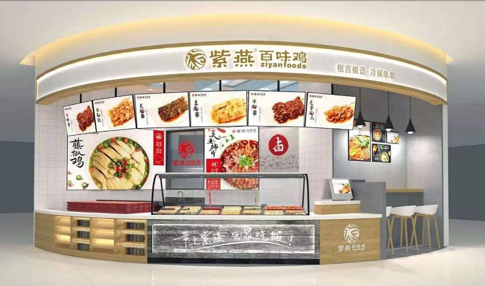 为了更好地支撑公司上市,改变消费者对紫燕只有社区店的品牌认知,紫燕启动商业超卖场渠道的市场开拓,通过对消费者的充足分析,结合卖场客流年轻化的人群特征,增加冷锅串串品类,以现代风格重新表达紫燕百味鸡的门店品牌形象输出,提炼“椒言椒语、冷锅串串”在门头上露出,传递门店产品特色。