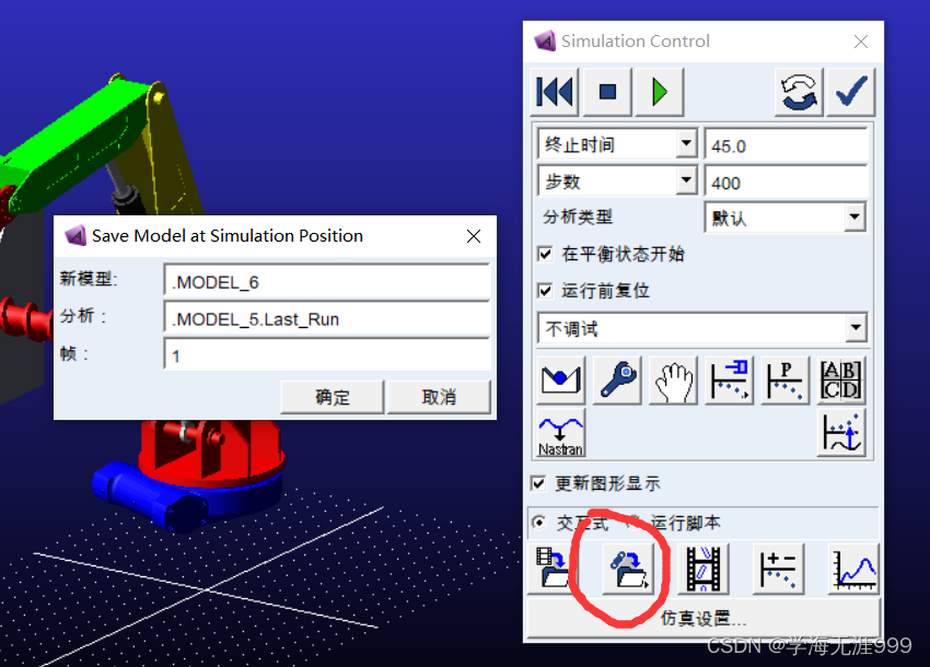 2.一种巧妙的改变方法是设置一个初始位姿的仿真路线,在仿真结束后点击图中的按钮,“将仿真后的模型另存为”,这样就可以将仿真后的模型姿态作为新模型的初始位姿!