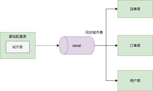 通过 canal 将基础配置数据库城市表同步到订单数据库,派单数据库,用户数据库。