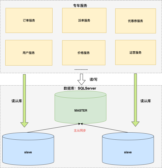 彼时的专车服务都连同一个 SQLServer 数据库,服务层已经按照业务领域做了一定程度的拆分。