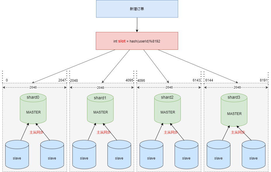 假设现在需要将订单表平均拆分到 4 个分库 shard0 ,shard1 ,shard2 ,shard3 。首先将 [0-1023] 平均分为 4 个区段:[0-255],[256-511],[512-767],[768-1023],然后对字符串(或子串,由用户自定义)做 hash, hash 结果对 1024 取模,最终得出的结果 slot 落入哪个区段,便路由到哪个分库。