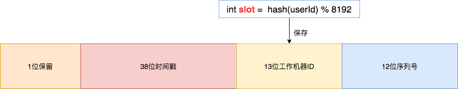 因为要支持 8192 个分片,雪花算法要做一点微调,雪花算法的 10 位工作机器修改成 13 位工作机器,时间戳也调整为:38 位时间戳(由某个时间点开始的毫秒数)。