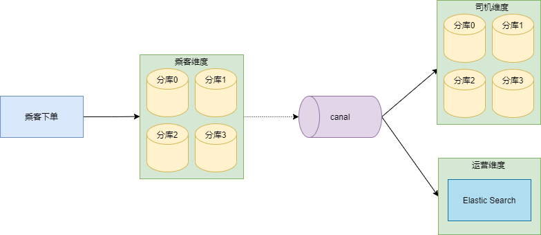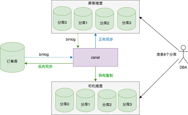 异构神器 canal 解析乘客维度四个分库的 binlog ,通过 SDDL 写入到司机维度的四个分库里。