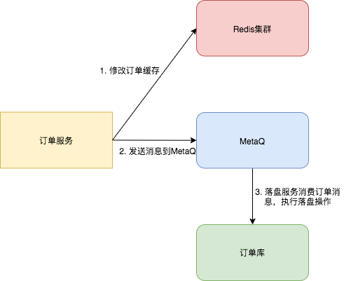 在订单的载客生命周期里,订单的修改操作先修改缓存,然后发送消息到 MetaQ ,订单落盘服务消费消息,并判断订单信息是否正常(比如有无乱序),若订单数据无误,则存储到数据库中。