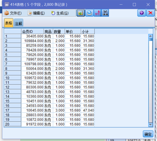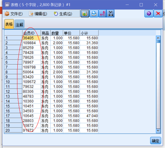 在原始数据表中,我们可以看到,表中共有2800条记录,有5个字段,分别是会员ID,商品,数量,单价,小计。其中,商品这个字段共有11个属性,分别是冻肉、罐装肉、罐装蔬菜、牛奶、啤酒、葡萄酒、蔬菜水果、甜食、鲜肉、饮料、鱼。如图2-1所示。