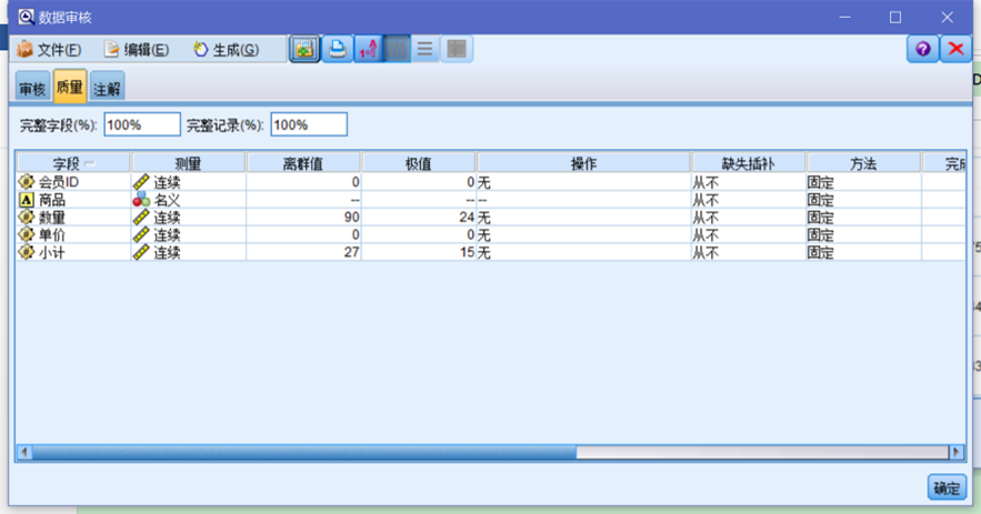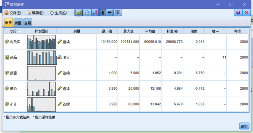 再观察过原始数据表之后,对原始数据进行数据审核,可以清楚地观察到各个字段的分布情况及其数据类型。分别如图2-2、2-3所示。在图2-2中可以看到5个字段的分布情况,及其最小最大值、平均值标准差等指标。在图2-3中可以看到各字段的属性,有连续型和名义型。从图中可以看到,5个字段的有效数据都是2800条,与总数据量是相同的,说明每条记录都是可用的有效的记录。