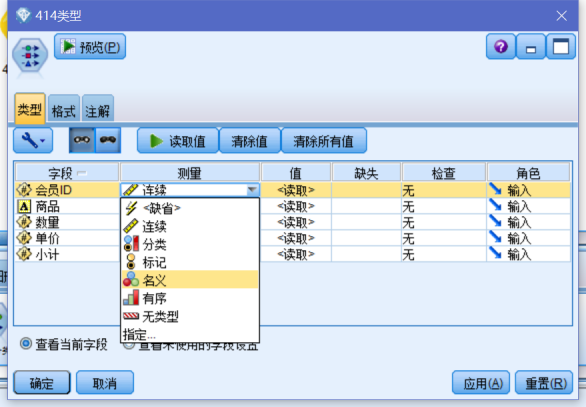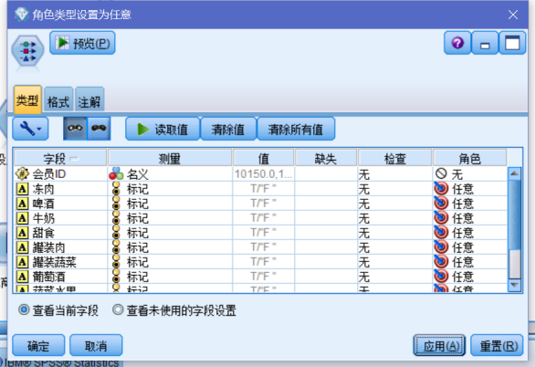 接下来,将使用Apriori模型继续对商品做关联分析。首先添加“类型”节点,改变各字段的角色为“任意”,表示在建模中各变量既是条件与是结果。如图3-6所示。