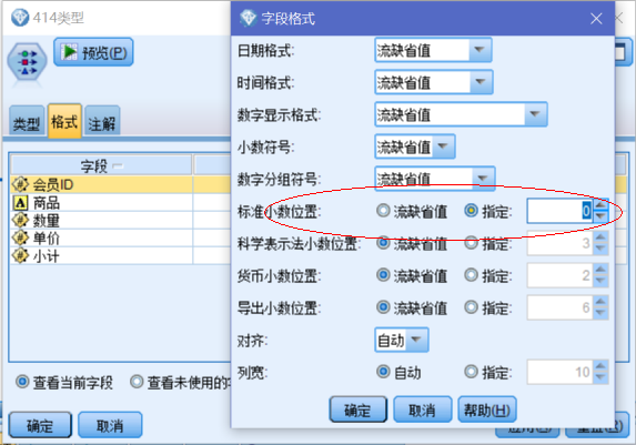 在2.2节中我们可以看到,“会员ID”字段的属性是连续型,但是作为一个对会员作区分的字段,它并没有实际意义,所以应该把会员ID的属性更改为名义型。如图2-4、2-5所示,在类型节点中进行修改,并将该字段的小数点显示位数改为0。这里说一句额外的话,如果把会员ID更改为名义类型后自动变成无类型的,那就是流属性的问题,在文件菜单里面找到流属性,将名义字段的最大成员数前面的勾取消掉就可以了。
