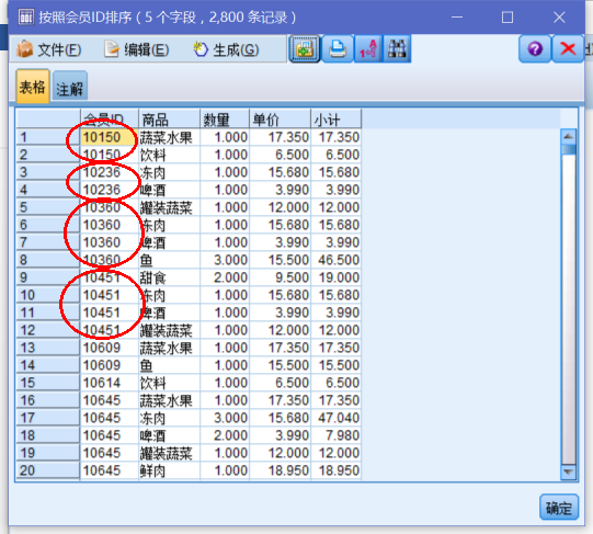 通过查找“36405”这个会员ID,发现这个顾客购买了冻肉、啤酒和饮料三种商品。根据直观观察来看,原始的数据集中是以每个会员ID每购一件商品为一条记录的,可能是以商品名为升序排列的。而购物篮分析是根据购物篮中的所有商品来分析其关联关系的。于是,先根据会员ID将数据表进行排序。得到结果如图2-7所示。