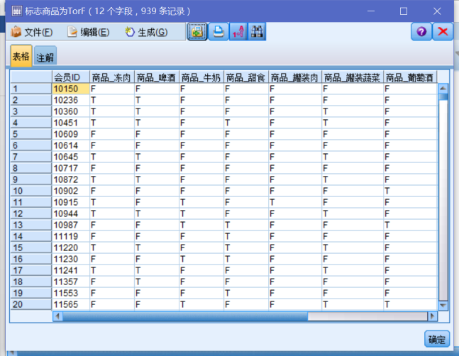 但是这仍然还达不到我们做关联分析的需求,我们想要的数据形式是每行代表一个用户,后面的字段是商品名,数据表中能体现出该用户是否购买了该商品。为了达到这个目的,选择设为标志节点进行处理,用商品字段进行标志操作,把名义变量的各类别设为多个新的变量,新变量的值出现为T,不出现F。过程和结果分别如图2-8和2-9所示。