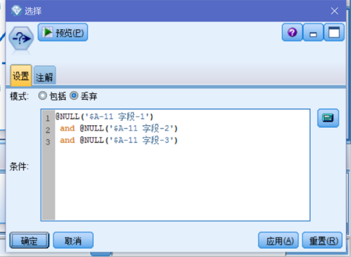 过滤之后,再使用选择节点,使用@NULL(FIELD)函数:若当前观测在变量FIELD上取系统缺失值$null$,则返回为真,否则返回为0。设置和结果分别如图3-10和3-11所示。