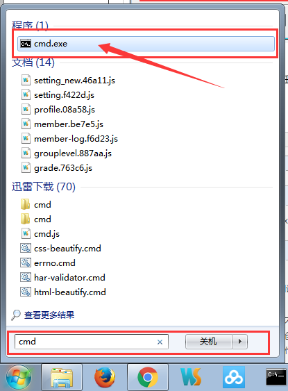 点击电脑开始菜单,搜索cmd,点击打开cmd命令行,如下图: