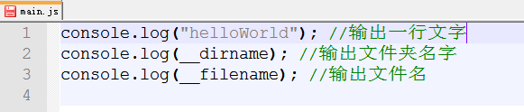 编辑 main.js。在里面写入如下图代码,输出文件夹名字和文件名, __dirname 和 __filename 为node内部变量,表示文件夹和文件名。(注意:是连着两个下划线)