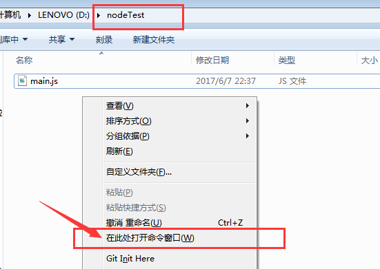 如果我们要在某个自定义的文件夹执行node,那么我们可以在 自己的文件夹 按住shift并点击右键,菜单中点击“在此处打开命令行”,即可定位到该目录