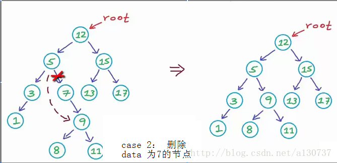 (2): 被删除的节点没有左子树,但是有右子树。 也就是说此节点left成员为NULL。