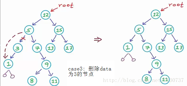 (3):被删除的节点没有右子树, 但是有左子树。 也就是说此节点right成员为NULL。