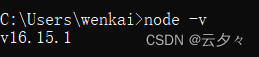 测试是否安装成功点击window+r,输入cmd打开控制台,输入node -v打开会显示显示当前nodejs版本号,如果不是可能是输入上面的错误或者没安装成功(注:v是小写不是大写,node后面要有一个空格在写-v)