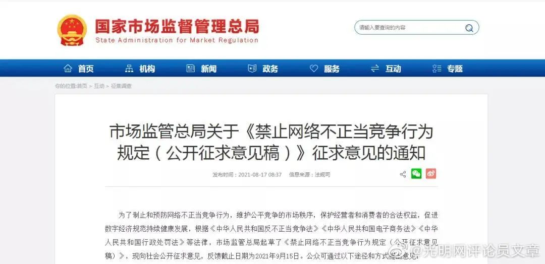 就在8月17日,国家司法部网站公布了市监总局关于《禁止网络不正当竞争行为规定(公开征求意见稿)》(下称《规定》)征求意见的通知。其内容涉及到了“二选一”、数据“杀熟”、虚假交易、流量劫持等网络不正当竞争行为。