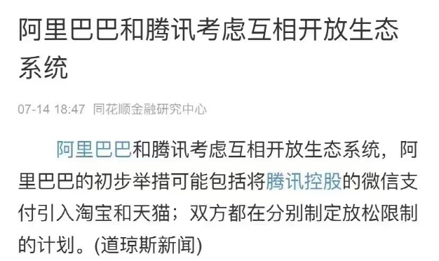 随后7月份时,据外媒报道,消息人士透露称,阿里巴巴的初步举措可能包括将腾讯的微信支付引入淘宝和天猫;双方都在分别制定放松限制的计划。此外,腾讯可允许阿里巴巴的电商信息分享到微信平台,或允许用户通过微信小程序使用部分限定的阿里巴巴的服务。