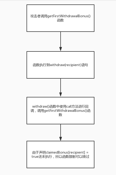 即使getFirstWithdrawalBonus()函数不能直接调用外部合约,但是它内部具有withdraw()函数可以调用。所以也就意味着,我们可以通过函数1调用函数2,并且由函数2中的回调函数进行恶意操作。