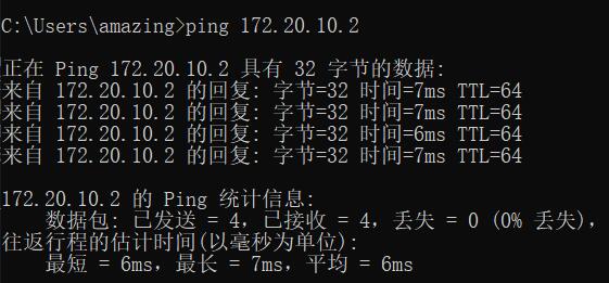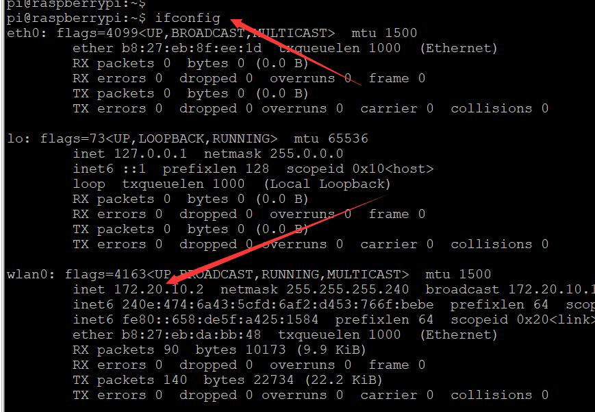 可以看到树莓派已经连接上了网络,并且ip地址为172.20.10.2,如果用windows来ping这个ip地址也是通的。(确保电脑和树莓派连接的是一个网络)。