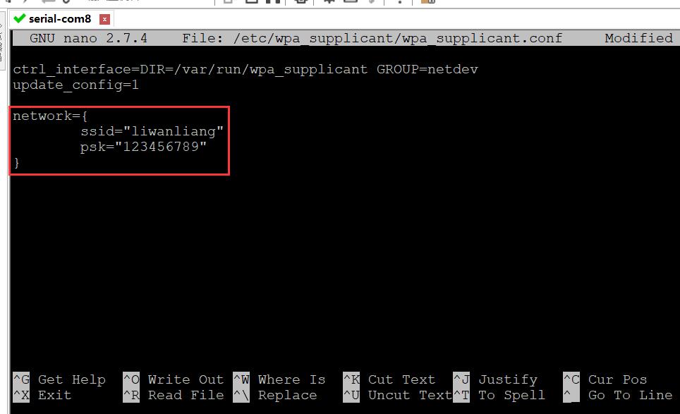 输入红色方框的文字,ssid表示网络名字或者热点名称,psk表示热点密码。(nano是文档编辑器,已进入便可以编写)