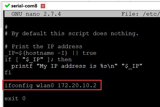 在命令行输入sudo nano /etc/rc.local命令,回车进入,后面添加一句ifconfig wlan0 172.20.10.2