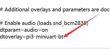 打开 config.txt文件,在末尾加上dtoverlay=pi3-miniuart-bt然后保存退出。