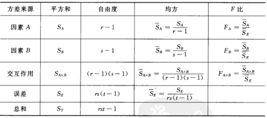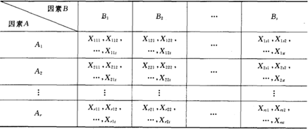 假设因素A有r个水平(A1,A2…..,Ar),因素B有s个水平(B1,B2……,Bs),每个ABzuhe进行t次独立试验,样本总数n